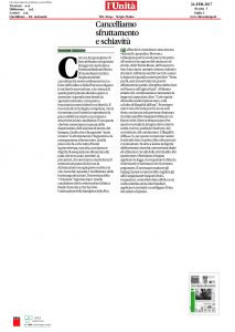 “Con una lunga stagione di lotta abbiamo conquistato la legge sul caporalato e l’intermediazione illecita di manodopera (prima inopinatamente cancellata dal nostro ordinamento)”. Inizia così l’intervento di Susanna Camusso pubblicato oggi su L’Unità che ricostruisce la tragica vicenda di Paola Clemente, morta di fatica nell’estate del 2015 nelle campagne pugliesi dove lavorava per 27€ al giorno. Schiavitù e sfruttamento si possono fermare. insieme però, lottando per i diritti e soprattutto non rassegnandosi mai.