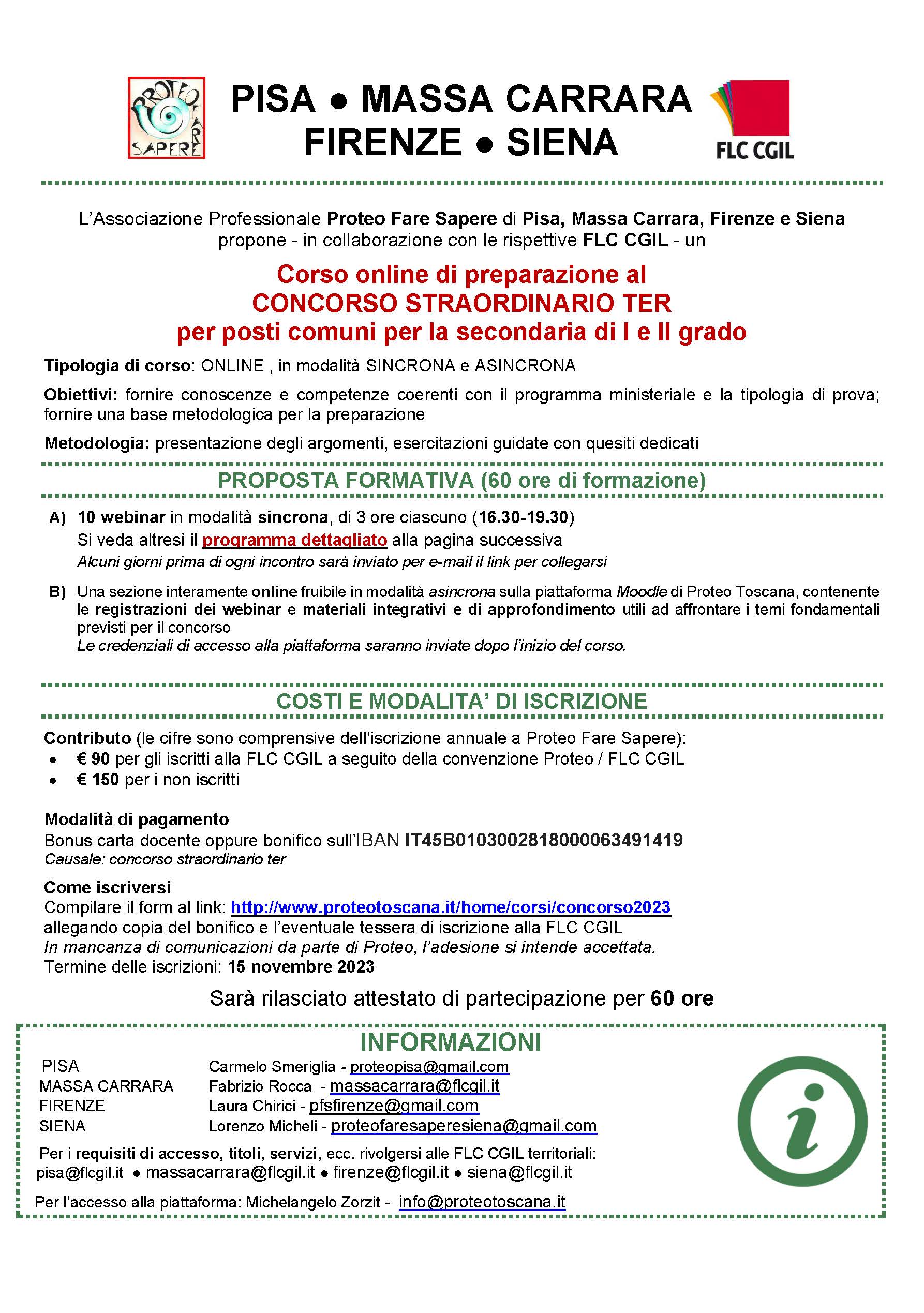 Siena, 13 novembre 2023 – L’associazione ‘Proteo fare sapere’ e la FLC CGIL di Siena organizzano un corso in preparazione al concorso straordinario ter per i docenti della scuola secondaria di primo e di secondo grado.
