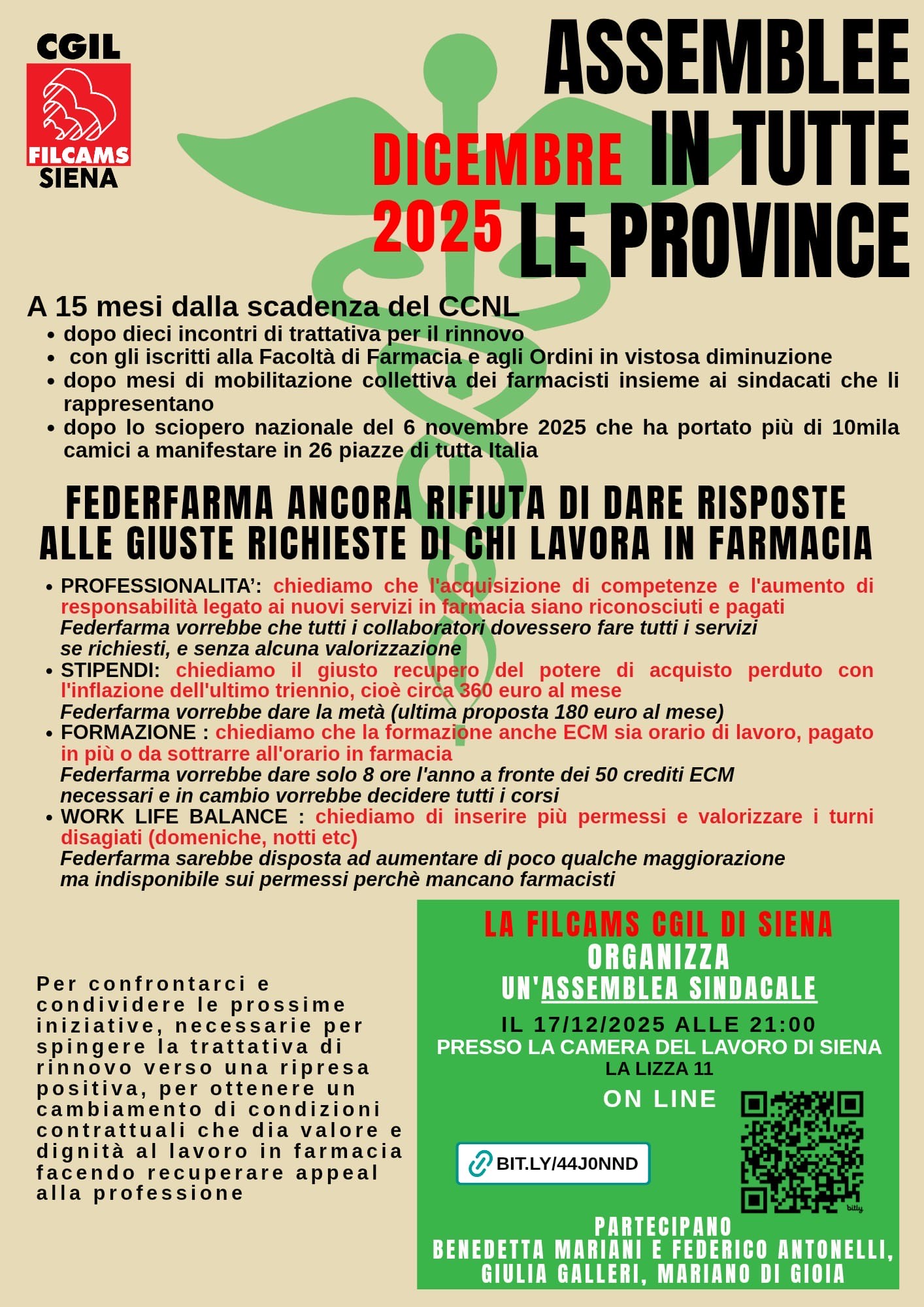 Farmacisti in assemblea presso la Camera del Lavoro di Siena il 17 dicembre, FILCAMS CGIL : “FEDERFARMA rifiuta il dialogo, necessarie nuove iniziative”.“Un anno di mobilitazione senza risposte, – spiega Di Gioia – a quindici mesi dalla scadenza del CCNL, dopo dieci incontri di trattativa per il rinnovo, Federfarma continua a non dare risposte alle giuste richieste di chi lavora in farmacia. La Filcams Cgil ribadisce le rivendicazioni fondamentali per il settore, i farmacisti chiedono il riconoscimento dell’acquisizione di competenze e l’aumento di responsabilità legato ai nuovi servizi in farmacia, attualmente Federfarma vorrebbe che i collaboratori svolgessero tutti i servizi se richiesti, senza alcuna valorizzazione delle professionalità acquisite. Chiediamo il giusto recupero del potere di acquisto perduto con l’inflazione dell’ultimo triennio. Chiediamo di inserire più permessi e valorizzare i turni disagiati, come domeniche e notti”.