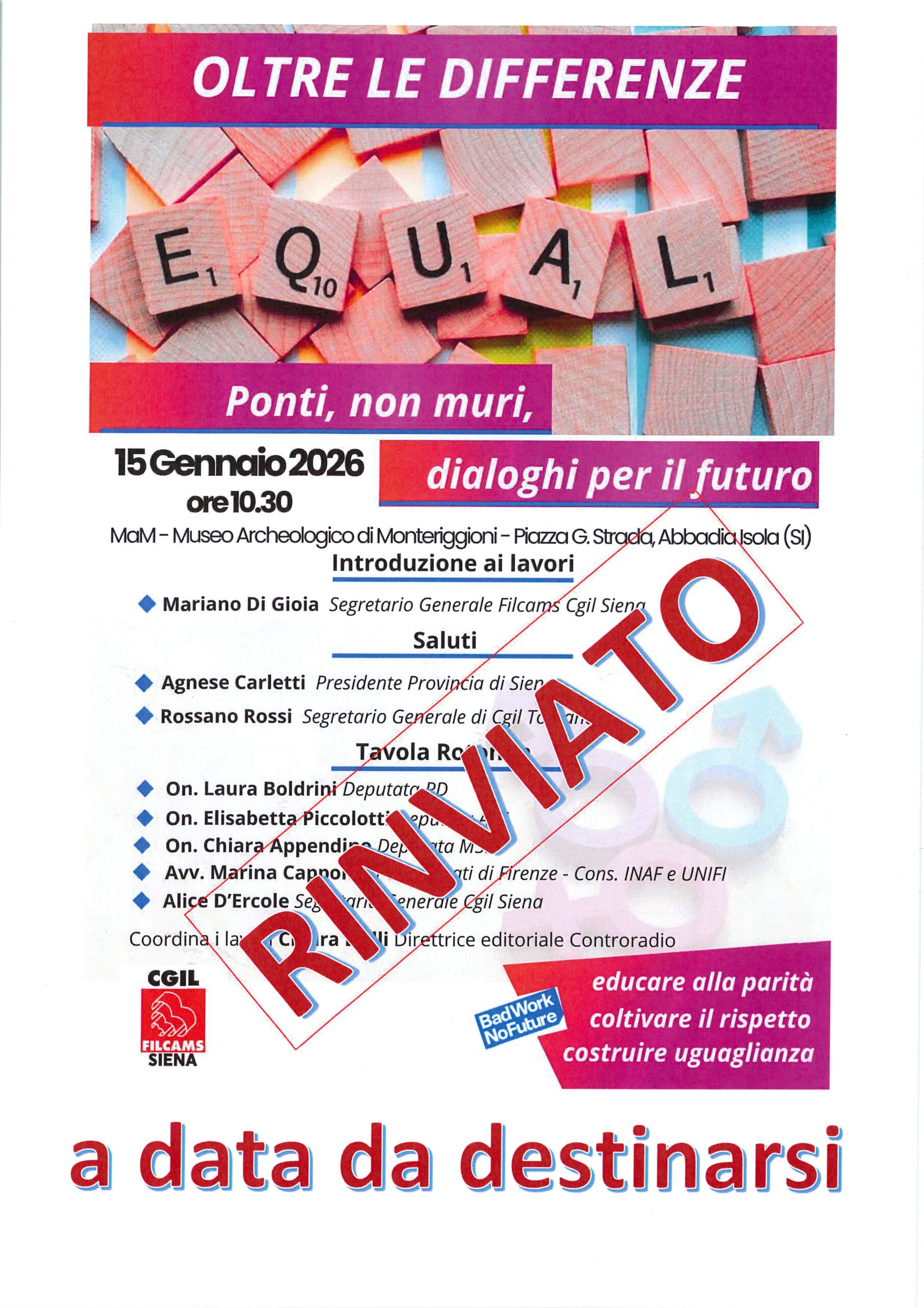 Rinviato evento FILCAMS CGIL Siena di domani “Oltre le differenze – Ponti, non muri, dialoghi per il futuro”.