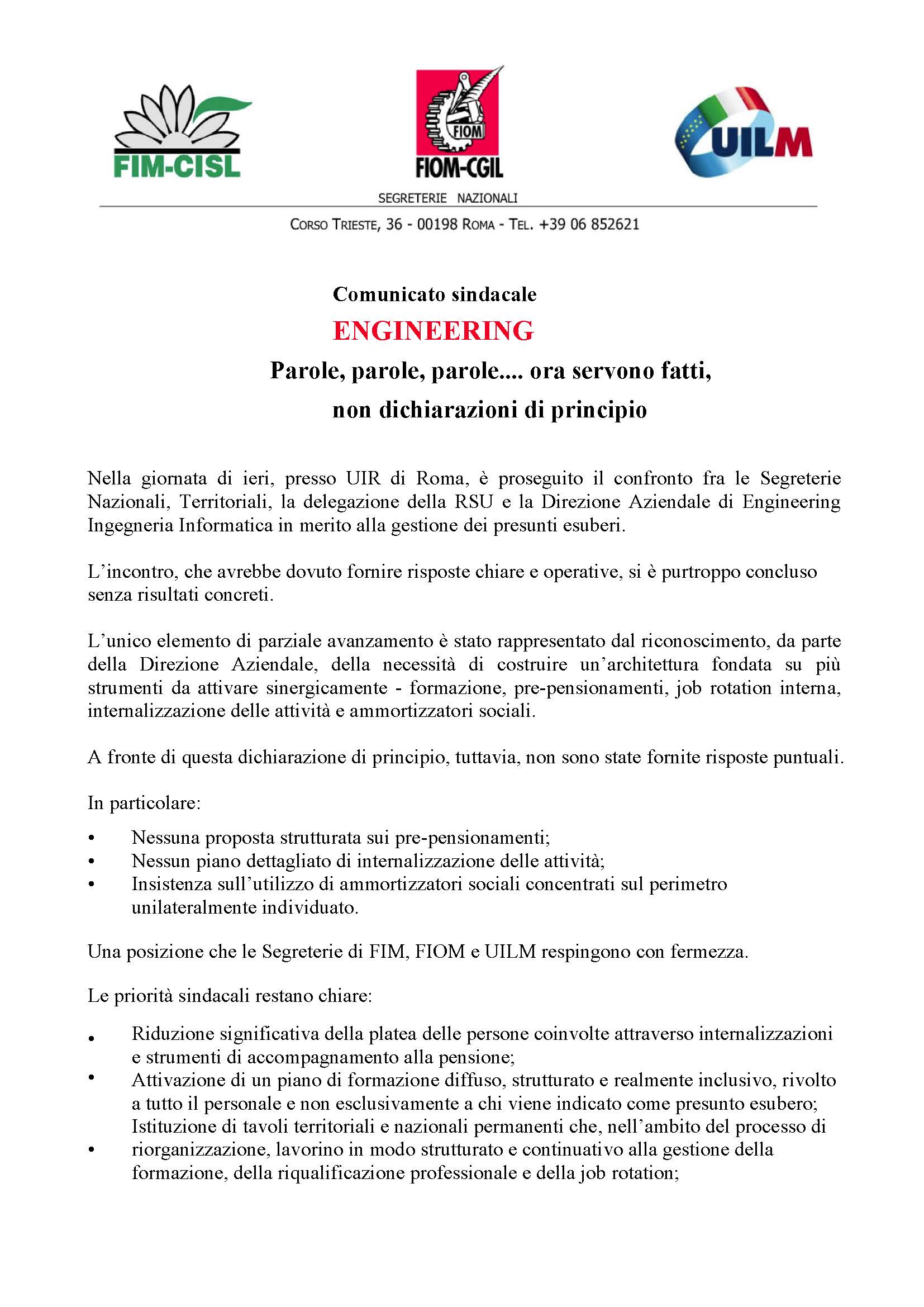 ENGINEERING Parole, parole, parole…. ora servono fatti, non dichiarazioni di principio