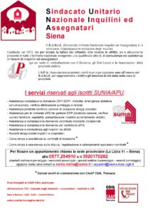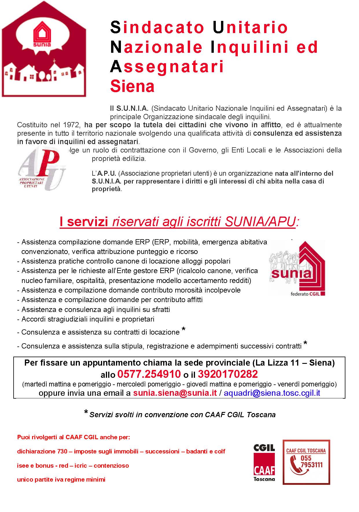 Il SUNIA è stato costituito nel 1972, ha oltre duecentomila famiglie iscritte ed è presente su tutto il territorio nazionale. Oltrechè svolgere una qualificata attività di consulenza ed assistenza a favore degli inquilini ed assegnatari, il SUNIA svolge un ruolo di concertazione e di contrattazione con il Governo, gli Enti Locali, le Associazioni della proprietà edilizia.